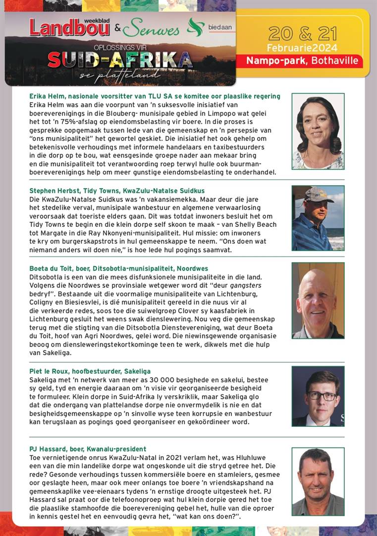 Gegrond op die formaat van Landbouweekblad se hoogs suksesvolle Bela-Bela-grondberaad in 2018, sal die suksesvolste gevallestudies van waar gewone Suid-Afrikaners besig is om beter gemeenskappe op te bou, ten toon gestel word.
