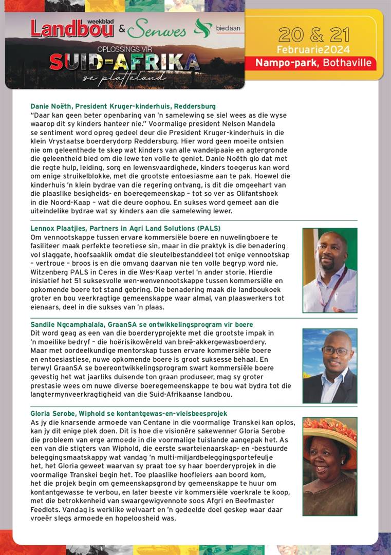 “As ’n publikasie wat al vir meer as ’n eeu landelike Suid-Afrika dien, het Landbouweekblad nie net ’n verantwoordelikheid om landelike Suid-Afrika te help herleef nie, maar ken ons ook die mense wat reeds ’n verskil maak deur beter, ryker en meer inklusiewe landelike gemeenskappe op te bou,” sê Chris Burgess, hoofredakteur van Landbouweekblad.