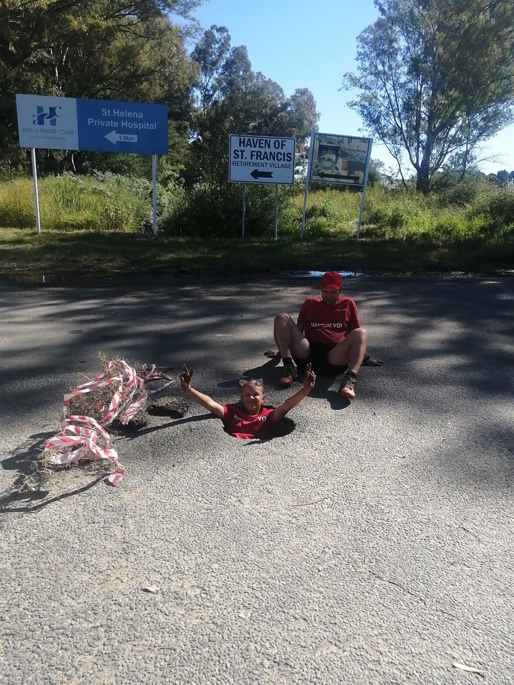 Die sinkgat op pad na die St. Helena-hospitaal kan volgens Jan Jacobs van die Handjie Vol-projek nie toegegooi word nie. “Daar moet ’n pyp ingesit word, want dit is deel van die stormwaterstelsel. Die grond wat ingeval het, moet uitgehaal word. Dit is ’n baie gevaarlike situasie,” sê hy. By Jessica Fouché, wat wys hoe diep die gat is, is haar pa, Eddie Fouché.