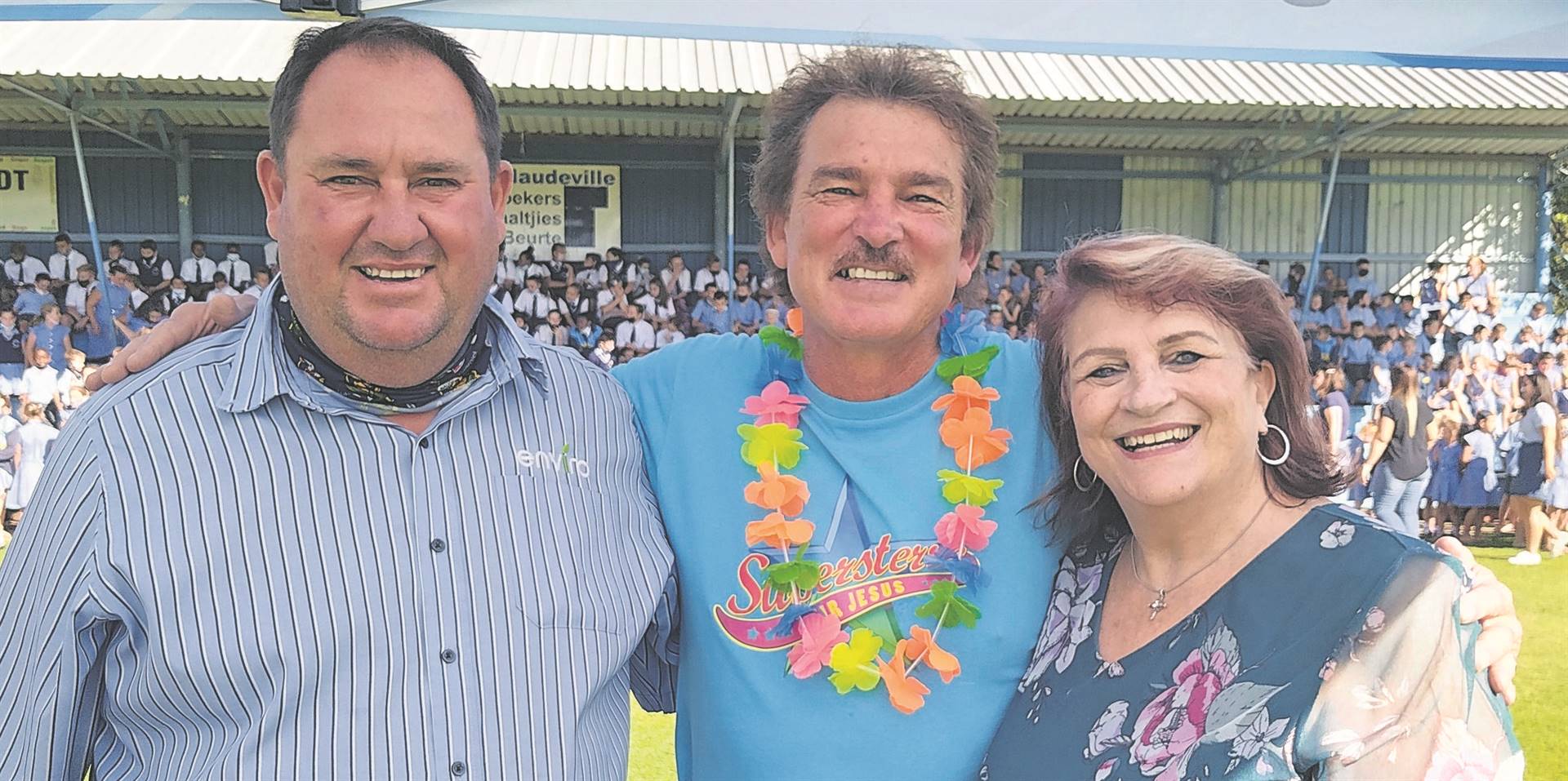 Die lofsanggroep Willie en die Wenspan het onlangs by die Primêre Skool Naudeville gekuier. “Dit was wonderlik om die Here te loof in die buitelug,” sê Tommie Doubell, skoolhoof. Van links is Doubell, Willie Pretorius en Louisa Burger (onderwyser). Foto: Verskaf