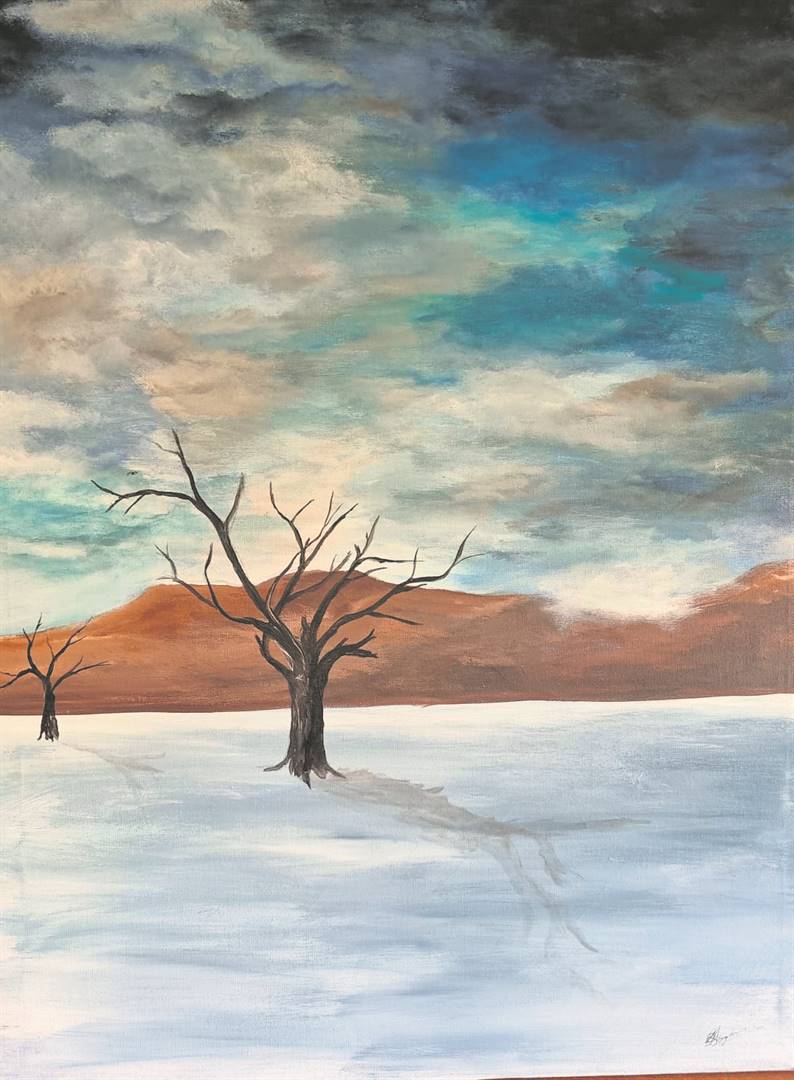 Sy het in 2014 ernstig begin skilder, en gebruik graag akrielverf op doek.