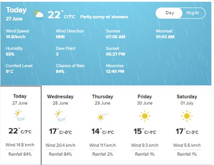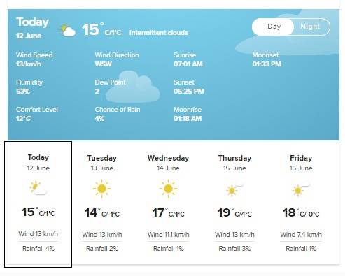Temperatures will range between 15°C and 18°C with the hottest day on 16 June (18°C), and the coldest forecast for 12 and 13 June (maximum of 15°C and a minimum of -1°C). There is a 3% chance of rain throughout the week.