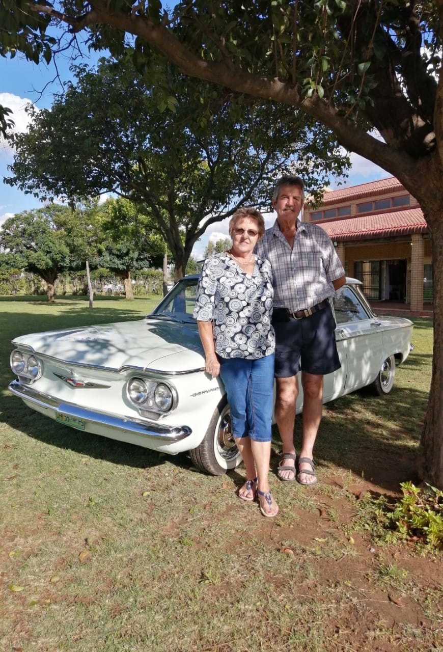 On Sunday, 13 November, the Welkom Classic Car Club members got together for a social braai at the club house that they share with the Riebeeckstad bowls club. They welcomed new members, Frans and Hannetjie Spreuw, into their happy family. Here are Hannetjie and Frans with their 1960 Chev Corvair.