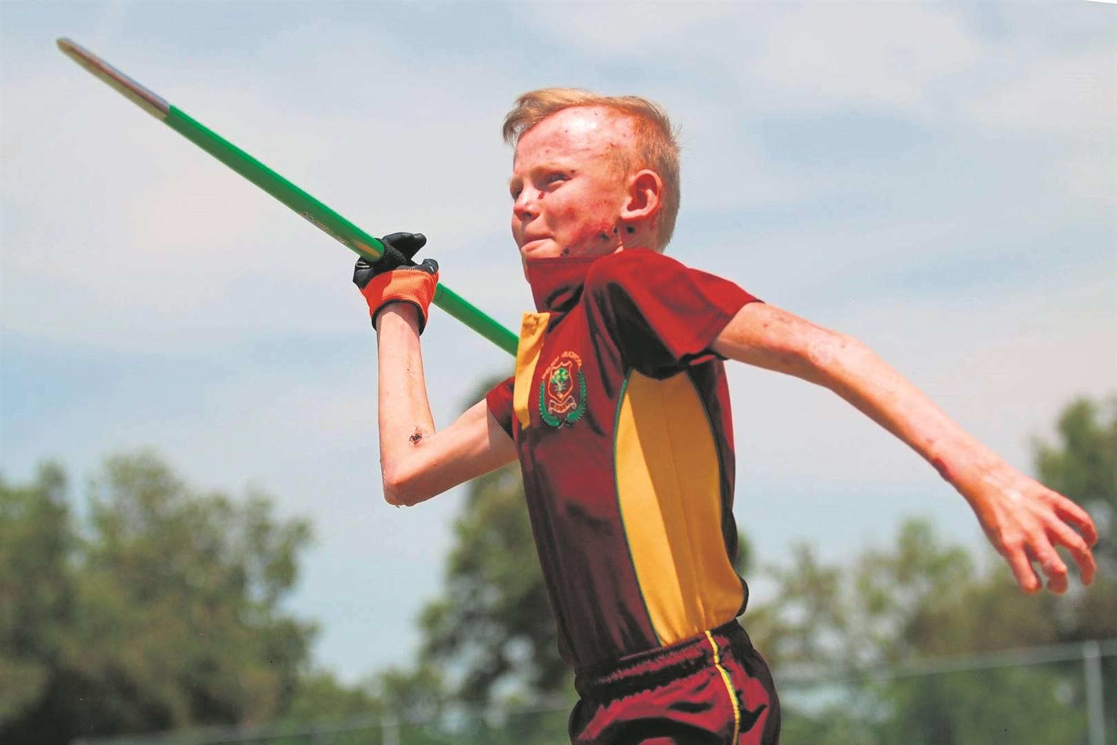 Hannes Taljaard (12) het vanjaar op die Welkom-Volkskool se sportbyeenkoms die eerste keer aan spiesgooi deelgeneem. Hy ly aan ’n seldsame siekte bekend as Epidermolysis Bullosa.Foto: Marnus Prinsloo