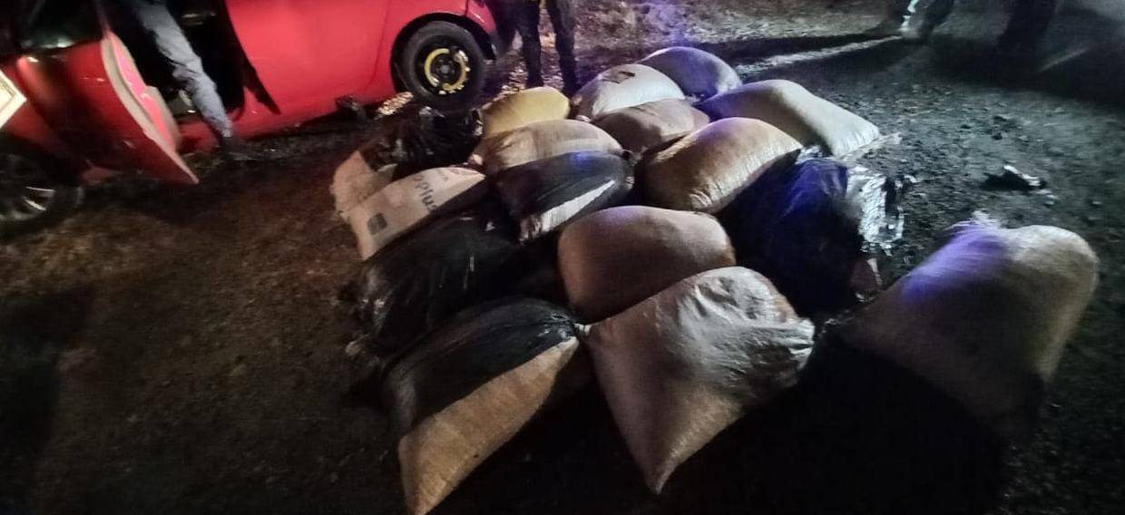 Die polisie het die sakke dagga op die agtersitplek en in die kattebak van die voertuig gevind. Daar is beslag gelê op die dwelms.