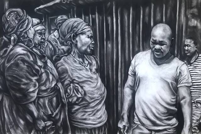 Nawa always has in mind a story he wishes to tell. In this instance, the challenges he noticed and personally faced in the informal settlements of Mfuleni (Cape Town), where he lived for some time. Challenges presents the viewer with ten charcoal drawings that reference identity, belonging, and the painful complexity of navigating cultural differences, acknowledging the resilience of the human spirit through his experiences, borne by his faith. It is a testament to the triumph of the human spirit and will leave the viewer deeply moved.