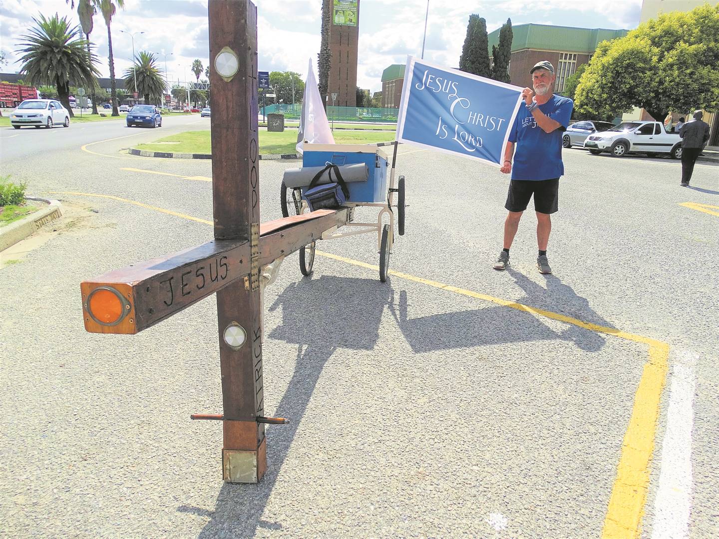Patrick Styles by die kruis waarmee hy oor Suid-Afrika heen stap om Jesus se naam te verkondig. Foto: Marti Will