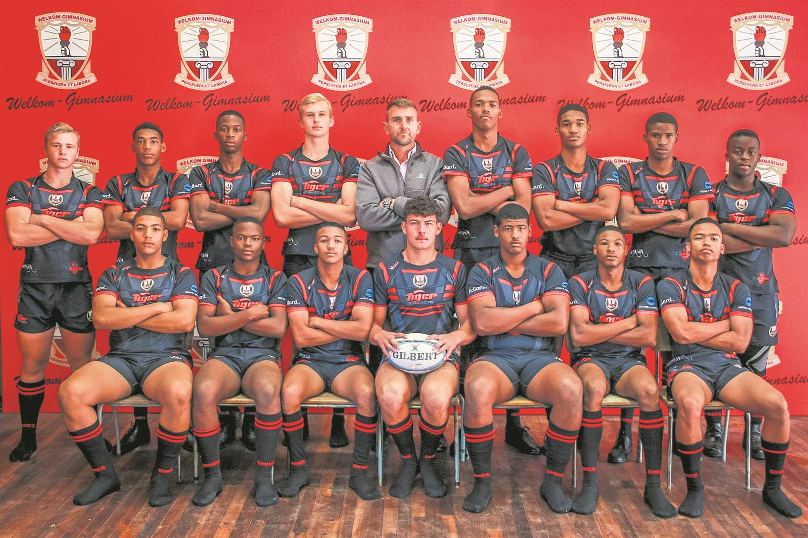 Welkom-Gimnasium se eerste rugbyspan is van links, voor: Mekyle Erasmus, Ayanda Silwanyana, Conlinn Treurnicht (onderkaptein), Wian Fourie (kaptein), Tristan Appolis, Onalena Oliphant en Ravion Cupido