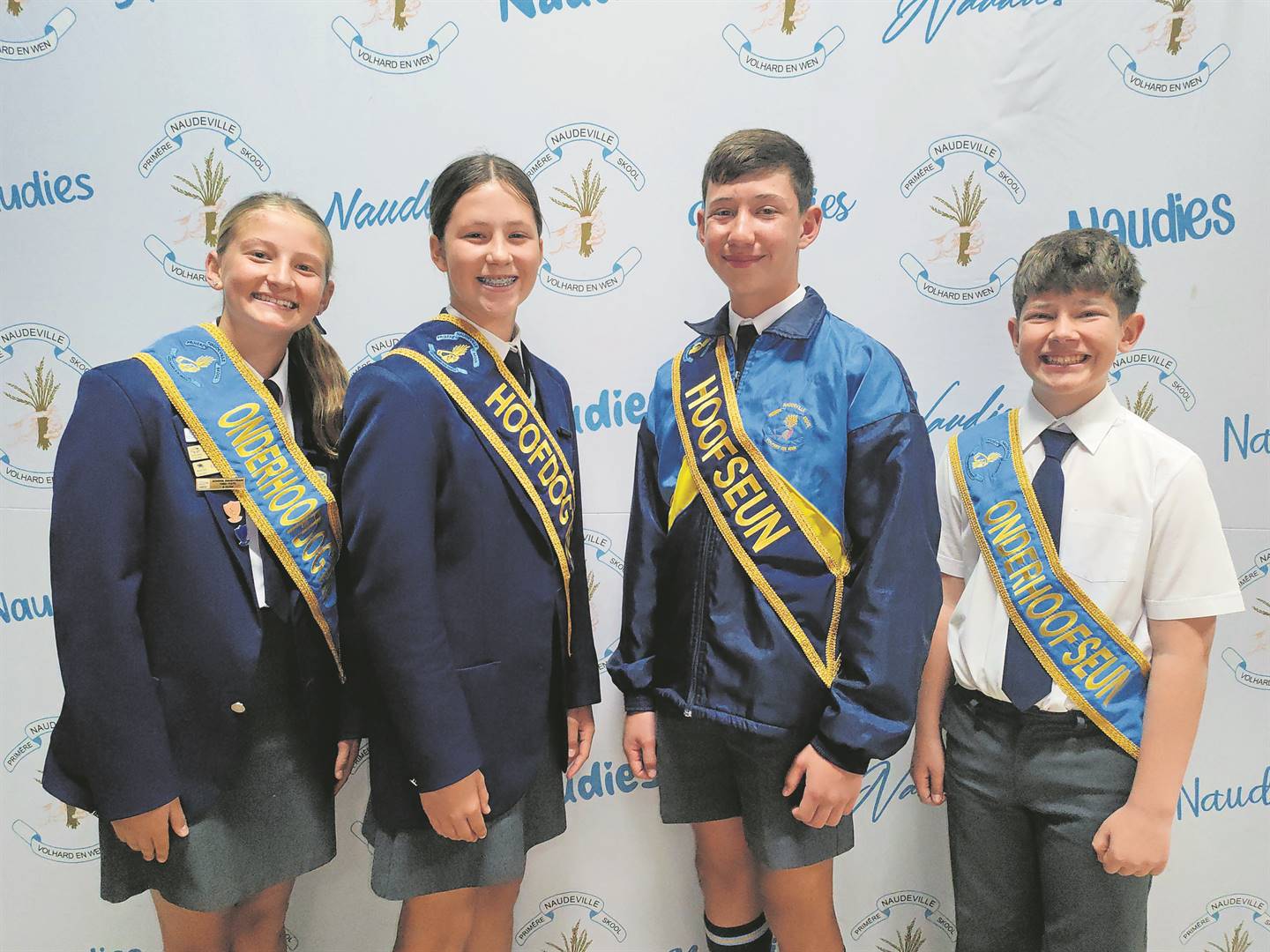By die Primêre Skool Naudeville tree die verkose leiers van elke graad kwartaaliks op as hoofleiers. Die finale keuse van hoofleiers word in die laaste kwartaal gedoen. Die hoofleiers vir die einde van 2024 is van links Margo Gouws (onderhoofmeisie), Ava Agresti (hoofmeisie), Cyril Long (hoofseun) en Ruben Bezuidenhout (onderhoofseun).Foto: Verskaf
