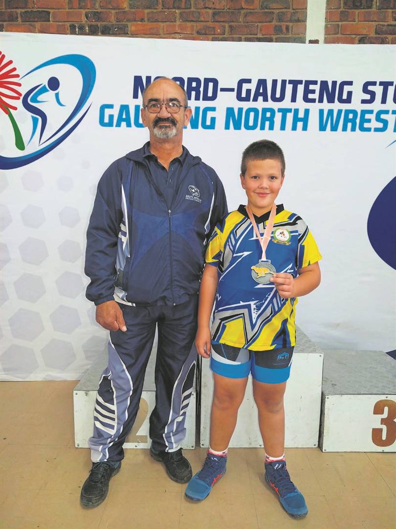 Kevin Mitton, ’n lid van die Goudveld-stoeiklub in Riebeeckstad, het Saterdag (20/05) ’n silwermedalje in die jaarlikse Vrystaatse ope stoeitoernooi verower, in die 52 kg-afdeling vir seuns o.8. Daar was 342 inskrywings in dié toernooi wat in Pretoria aangebied is. Hier is Kevin saam met Wiets Behr (afrigter). Foto: Verskaf