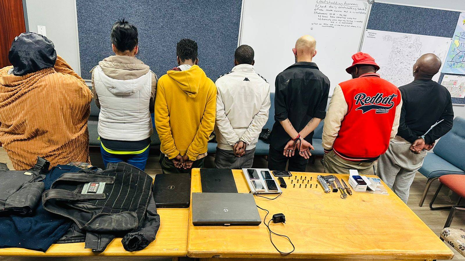 The Welkom Public Order Policing (POP) received information about a group of suspects who committed a business burglary at a clothing store in the Welkom CBD. They forced their way into the store by cutting open the roof, with many cellphones then stolen.