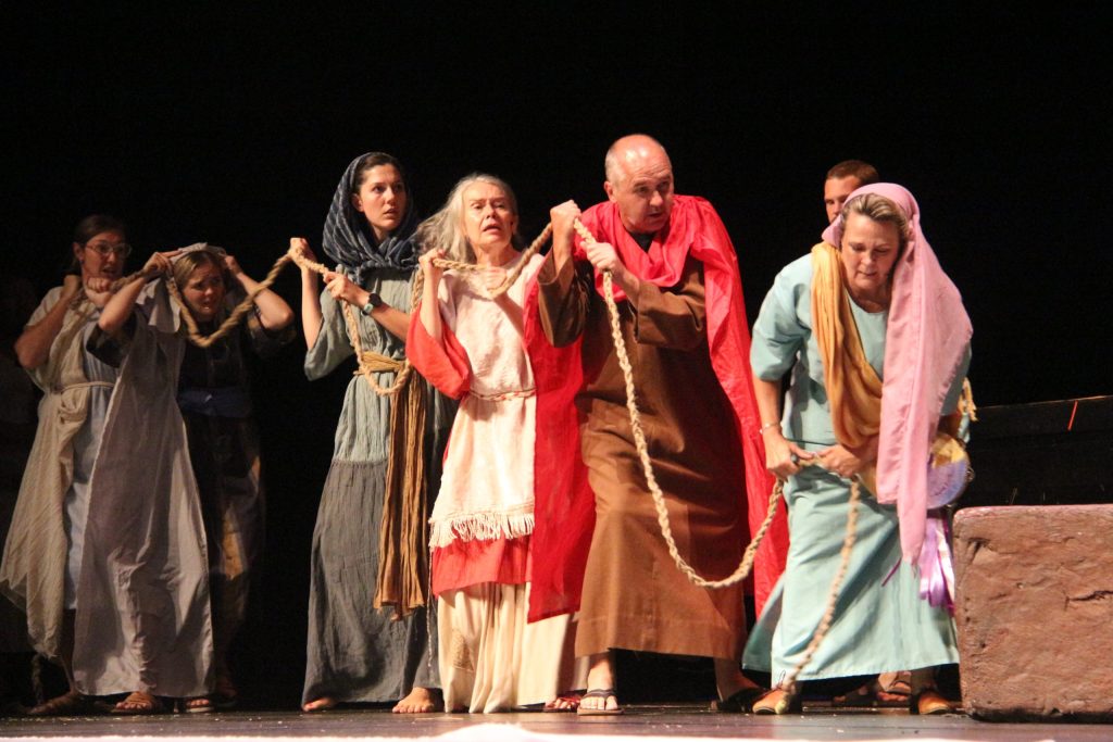 Die lede van die teatergeselskap vervul die rolle van individue en ook die twee volke wat sentraal in die toneelstuk staan: Israel en die Egiptenare.