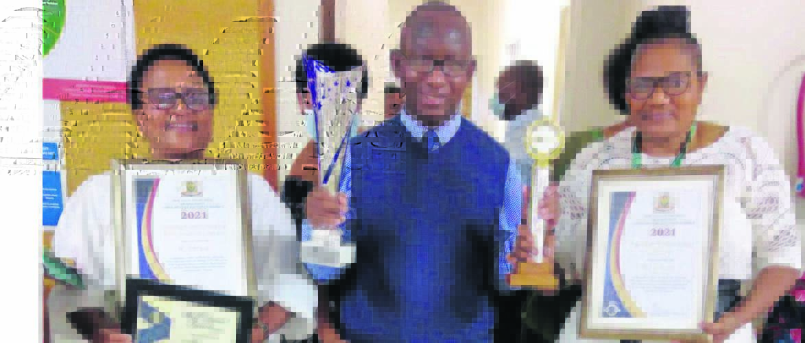 During the Well Done Function of the Free State Department of Education in the Lejweleputswa Education District the Kheleng Secondary School in Hennenman received a silver status for a 90,6% pass rate in the 2021 senior certificate examination. From the left are Mapontsho Rampai (teacher at the school, who received an award for achieving a 100% Maths Literacy pass rate), Molahlehi Mosia (principal) and Thembi Mpeloane (teacher, who received an award for achieving a 100% History matric performance). The principal was honored with a silver certificate and trophy, and he also received a certificate for excellent performance in the Lejweleputswa district. Photo: Supplied