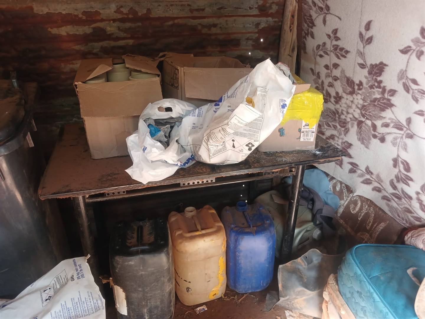 Boraks-sout, ’n chemikalieë wat gebruik word wanneer gouddraende materiaal tot amalgaam verwerk word, 41 smeltpotte en agt bakke wat gebruik word vir die verwerking van goud, asook ’n blaasvlam is in ’n tydelike werkswinkel aan die agterkant van die huis gevind.