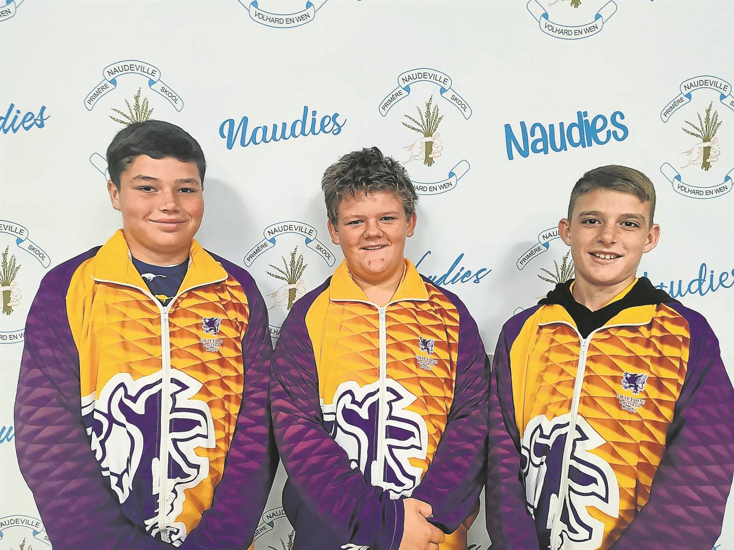 Drie leerlinge aan die Primêre Skool Naudeville is vir die Griffons o.12-rugbyspan gekies. Van links is Dohandré Janse van Rensburg (o.12B), Ulrich van Schalkwyk (o.12A) en Nardus Cronje o.12A). Foto: Verskaf