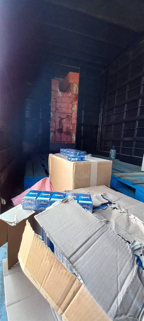 Hierbinne het die polisie bokse met kartonhouers onwettige sigarette gevind.