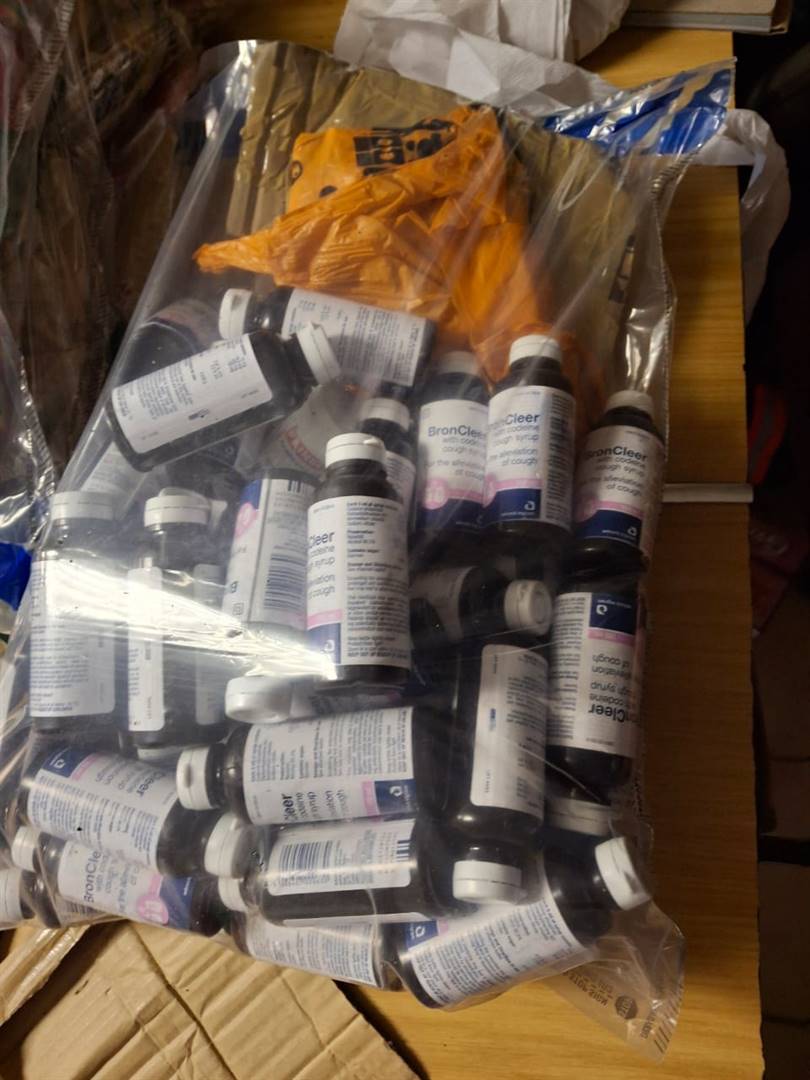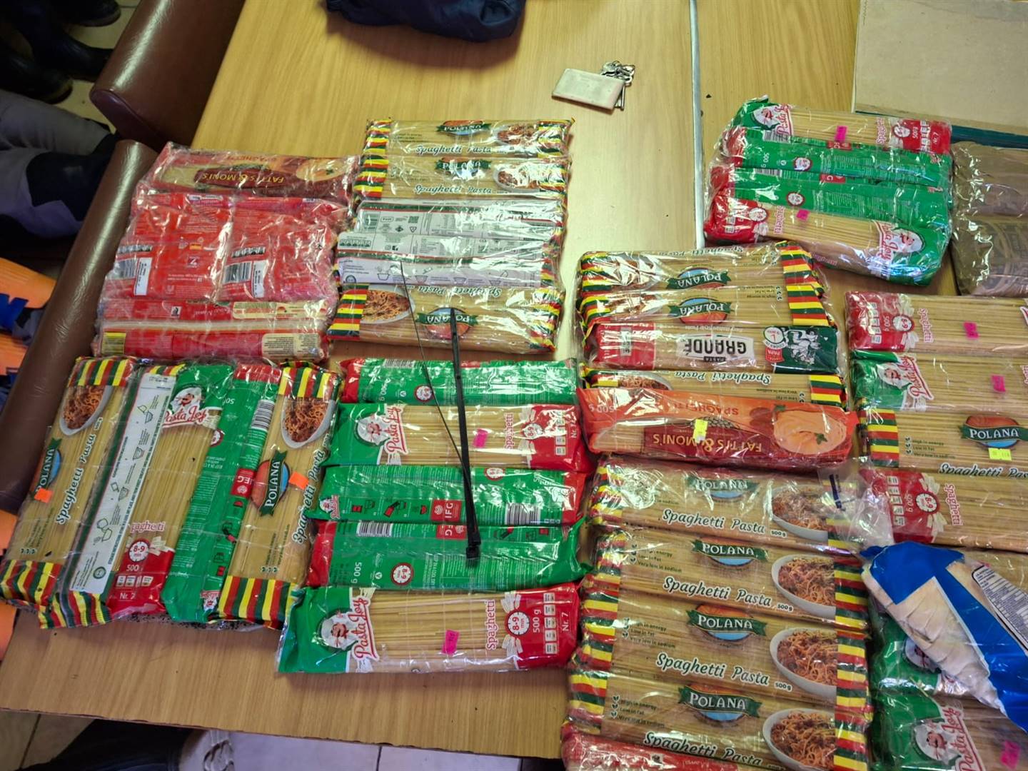 Toe die polisie die verdagtes deursoek het, het hulle het op smokkelgoedere soos BronCleer-hoesstroop, spaghetti, rys, brood en soja-maalvleis gevind en ook vyf selfone is gekonfiskeer. ’n Saak van sameswering om misdaad te pleeg, met bykomende aanklagte van oortreding van myngesondheid-en-veiligheid en geldwassery word ondersoek, sê Covane.
