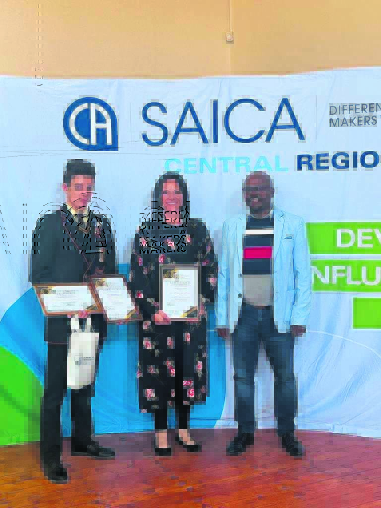 A Gr. 12 learner of Welkom-Gimnasium, Miguel Sardinha, obtained a first place in the Free State in the South African Institute of Chartered Accountants (Saica) Olympiad. He received a bursary to study at the University of the Free State (UFS), as well as a laptop, from Saica. With Miguel are his teach­er Retha van der Merwe and Saica representative KB Mokoatsi (who is the subject advisor in Lejweleputswa).Photo: Supplied