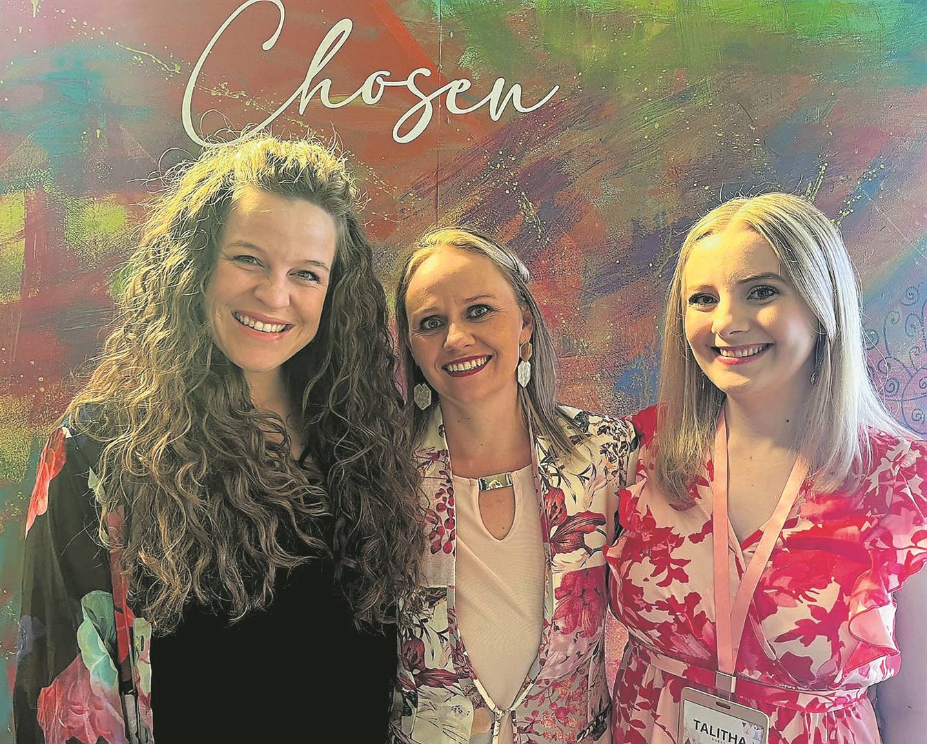 Die vierde Chosen-vrouekonferensie, met die tema “You are God’s Masterpiece”, is by die AGS kerk in Bethlehem aangebied. Dit was die tweede keer dat die geleentheid in Bethlehem aangebied is. Sowat 215 vroue van oor die land heen het die geleentheid op 21 en 22 Oktober bygewoon. “Die doel van die konferensie was om vroue hul waardigheid terug te gee, sodat hulle besef dat hulle unieke meesterstukke van God is,” sê Charmaine Grundlingh, spreker en organiseerder. Van links is Clarice Visser, Grundlingh en Talitha Rautenbach, wat sprekers op die konferensie was.Foto: Verskaf
