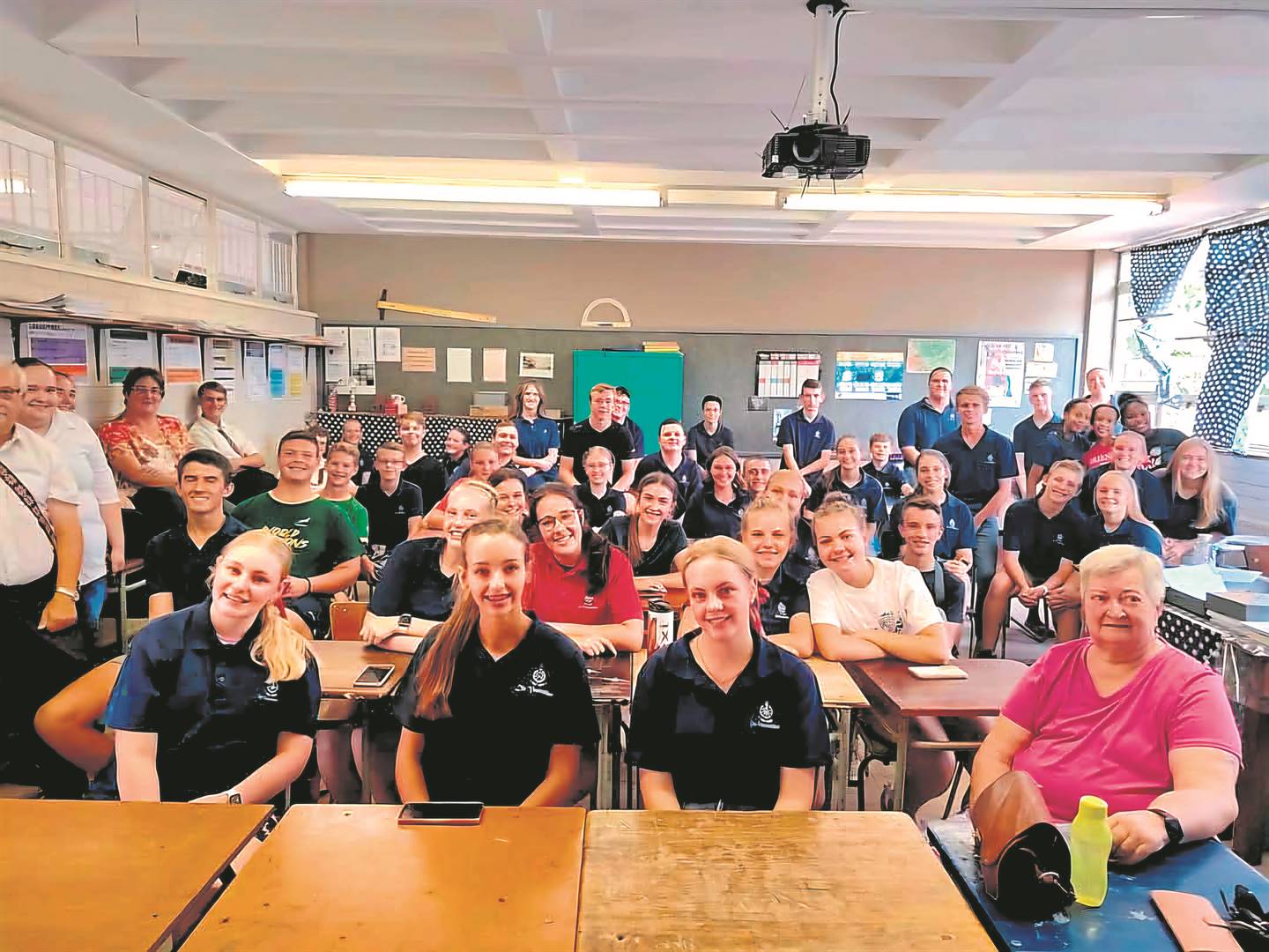 Die Voortrekkers se Kroon-kommando van Kroonstad het op Dinsdag 4 Februarie, wat ook Wêreldkankerdag is, ’n besoek by die liefdadigheidsorganisasie Northern Free State Caregivers (NFSCG) in Kroonstad afgelê. Daar het Minnie Burger, wat kanker oorleef het, haar inspirerende storie as kankeroorwinnaar met die lede van die kommando gedeel. Hier is die kommando saam met Minnie Burger (heel regs, voor) in pienk, tydens die besoek. Foto: verskaf