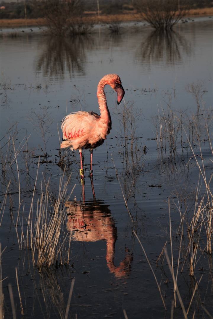 ‘n Beseerde kleinflamink wat vroeër vanjaar in ‘n doringbos vasgekeer is, is na behandeling gerehabiliteer en weer op Kamfersdam vrygelaat. Foto: Charné Kemp