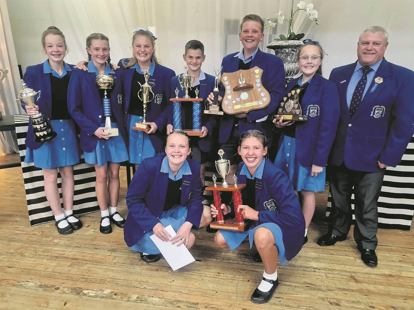 Dié gr. 7-leerlinge aan die Laerskool Jordania in Bethlehem het op 3 November spesiale eerbewyse op die jaarlikse prysuitdelings­geleentheid ontvang. Van links is, voor: Linique Human (Knobel-eerbewys vir verdienstelikheid) en Carli Uÿs (sportmeisie)