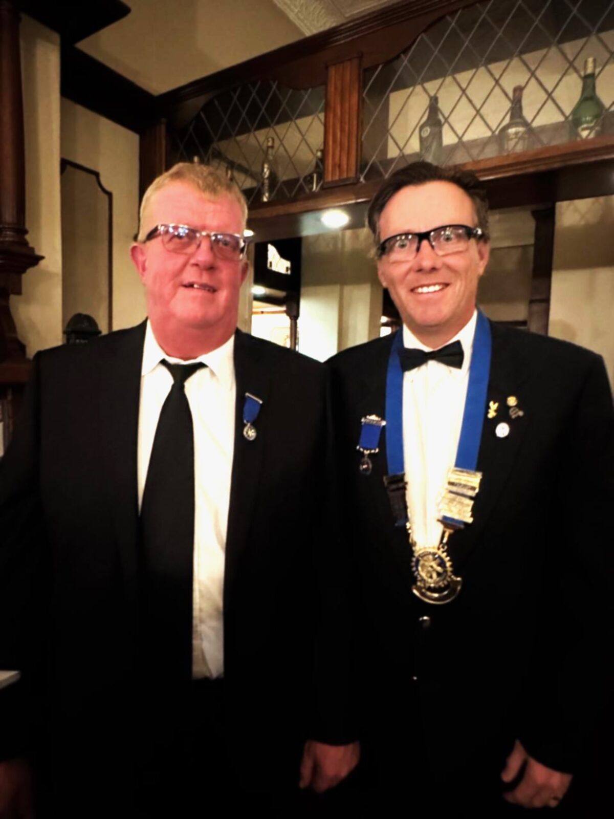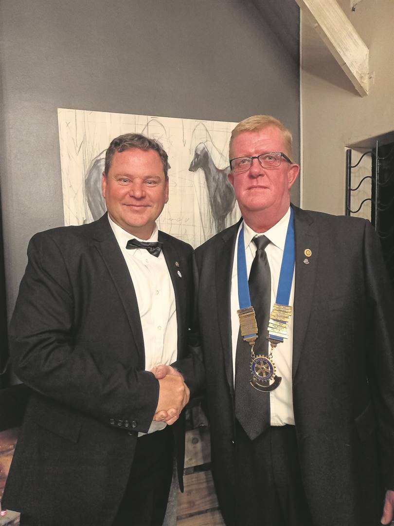Leon Roos (regs) is as president van die Bethlehem-Rotary-klub ingehuldig. Saam met hom is Willie Hattingh, uittredende president. Foto: Verskaf