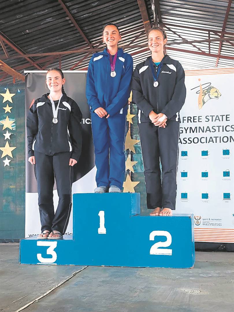 Ixoré Cilliers van die Bethlehem-gimnastiekklub is Saterdag (20/08) in Bloemfontein vir die Vry­staatspan gekies. Sy was vierde in haar afdeling. In Noord-Vrystaat-gimnastiek se kwalifiserings­ronde op 13 Augustus in Bultfontein was sy eerste op vlak 6 in die ouderdomsgroep vir gim­naste 14 jaar en ouer. Op 6 Augustus het sy in die Helena Botha-gimnastiekklubkompetisie ’n silwer­medalje en twee bronsmedaljes verwerf. Sy was vierde in haar ouderdomsgroep. Ná Noord-Vry­staat-gimnas­tiek se kwalifiseringsronde is van links Suene Gouws (Senekal, derde), Ixoré (eerste) en Lenor Roode (Senekal, tweede). Suene en Lenor het albei ook die Vrystaatspan gehaal.Foto: Verskaf