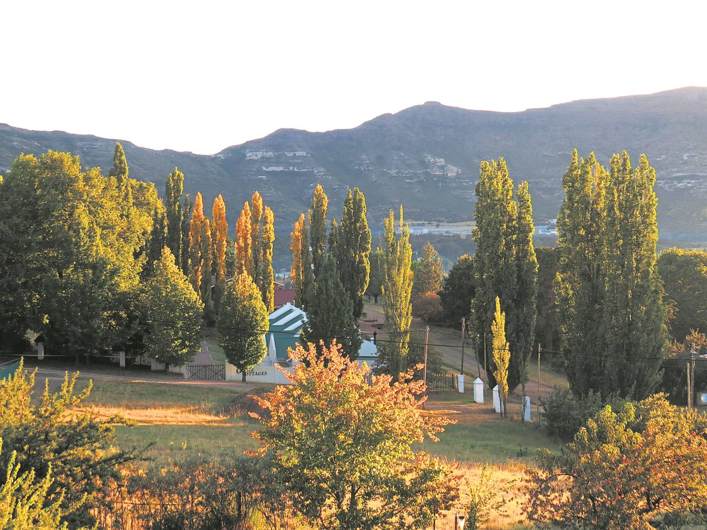 Hoewel die Vrystaat vroeg in die herfs nog bloedige warm weer ervaar, is temperature soggens en saans reeds effens laer. Die Suid-Afrikaanse Weerkantoor in Bloemfontein voorspel dat warm toestande in dié week oor die Noord- en Oos-Vrystaat sal voortduur – met maksimum temperature wat bo 30 °C sal draai. Geen, of ’n minimum, reën word voorspel. Die natuur volg egter sy eie program, en die omgewing by Clarens is wel besig om sy herfsbaadjie aan te trek. Bome verkleur stelselmatig in die mooiste, warmste skakerings van hierdie seisoen. Foto: Cecile Nijland