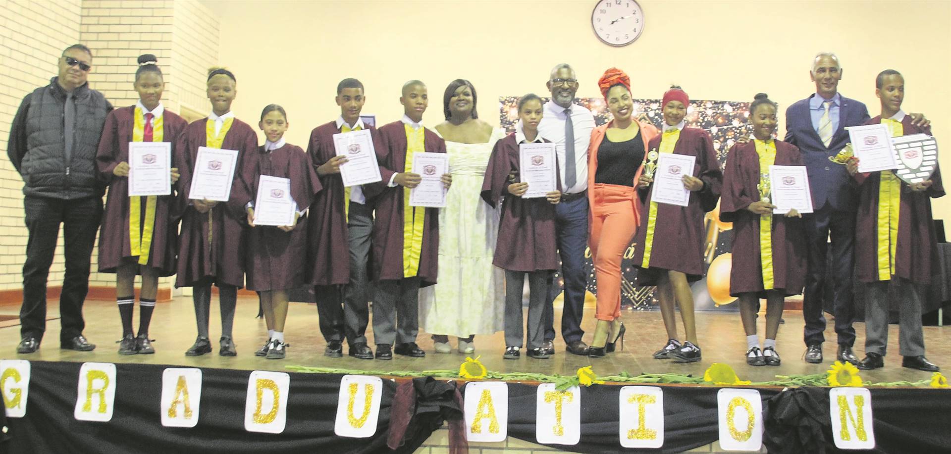 Grosvenor Primêr het onlangs sy beste graad 7-leerders aangewys. Links staan hulle saam met personeellede by die onlangse skool-prysuitdeling. Foto: David Rossouw