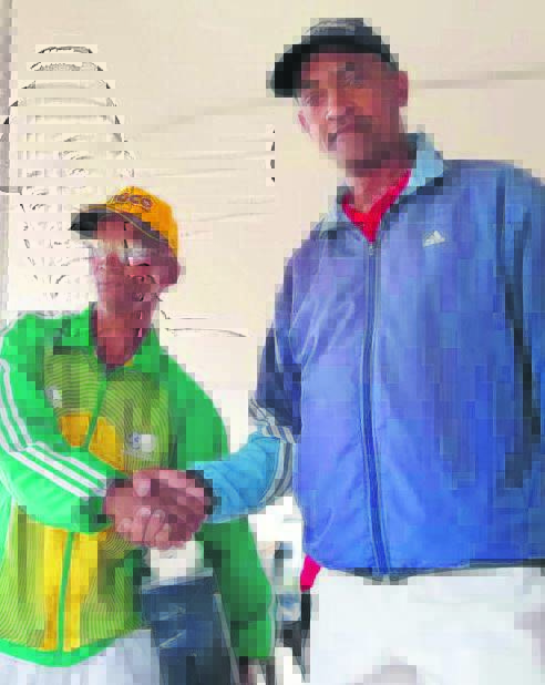 Shawn Conrad, voorsitter van die Atlantis-gholfklub, wens Willem Beukes geluk nadat hy die klub se maandelikse medaljekompetisie gewen het.
