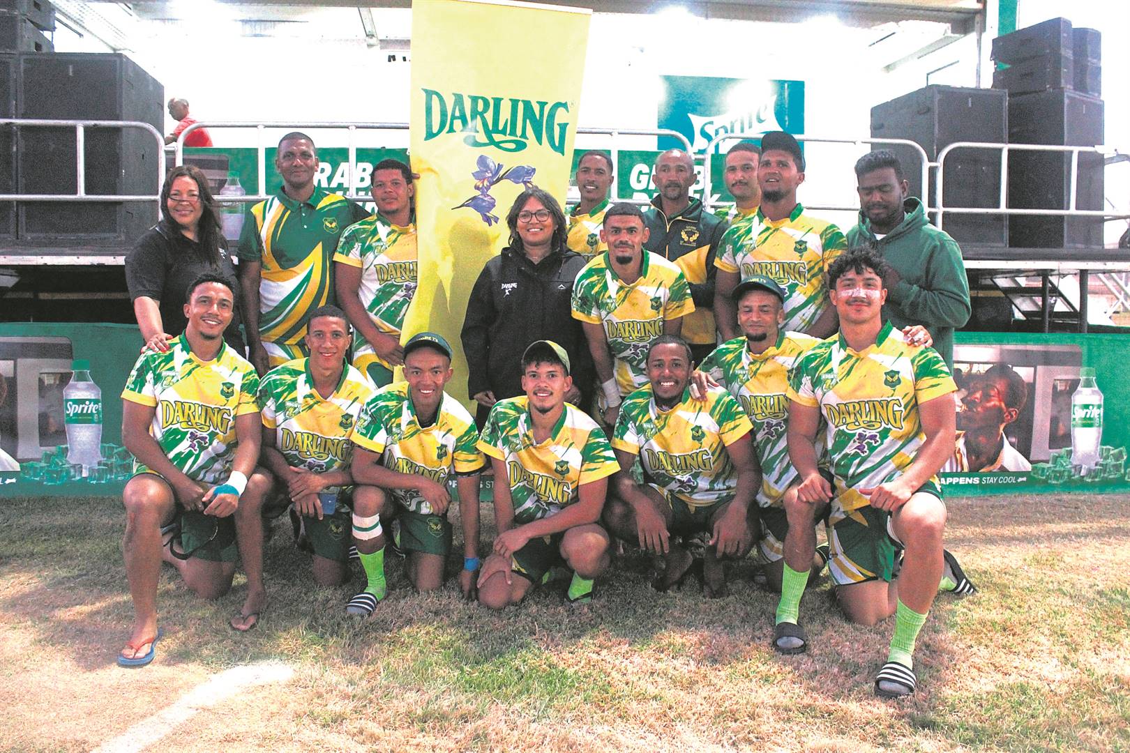 Mamre het ’n tweede agtereenvolgende keer teen St. Georges in die eindstryd van die jaarlikse Darling-7’s-toernooi vasgeval. Saam met die span staan Edwina Fredericks (agter, links) en Amanda Easau (middel) van Darling Romery. Foto: David Rossouw
