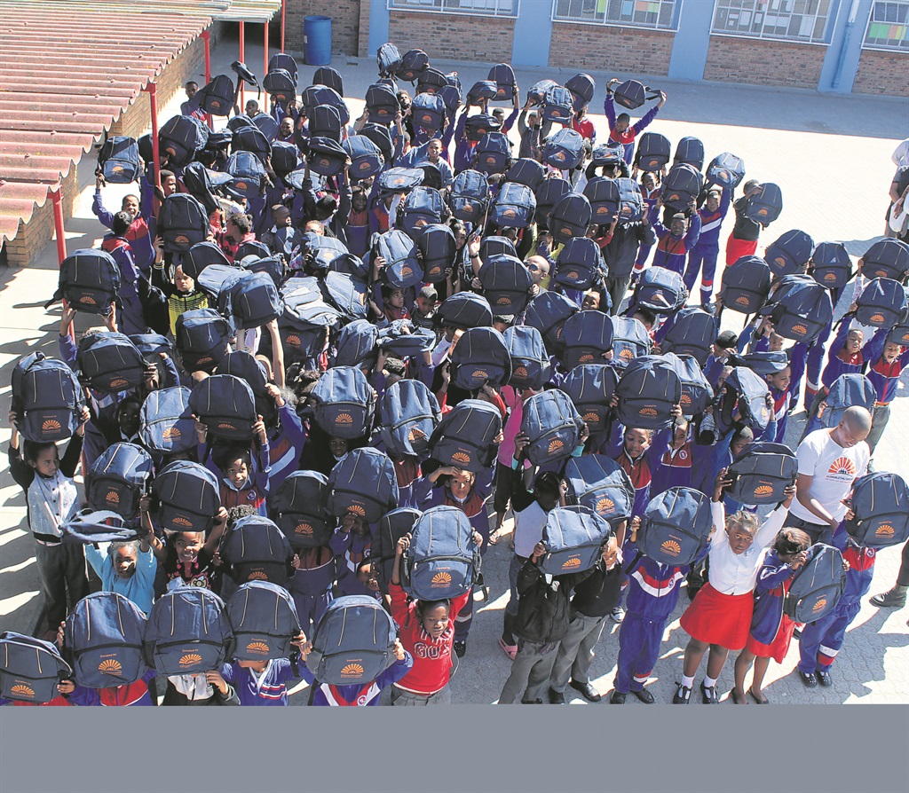 Pupils from Kerria Primary are very excited about their new school bags. Photo: Joline van der Merwe