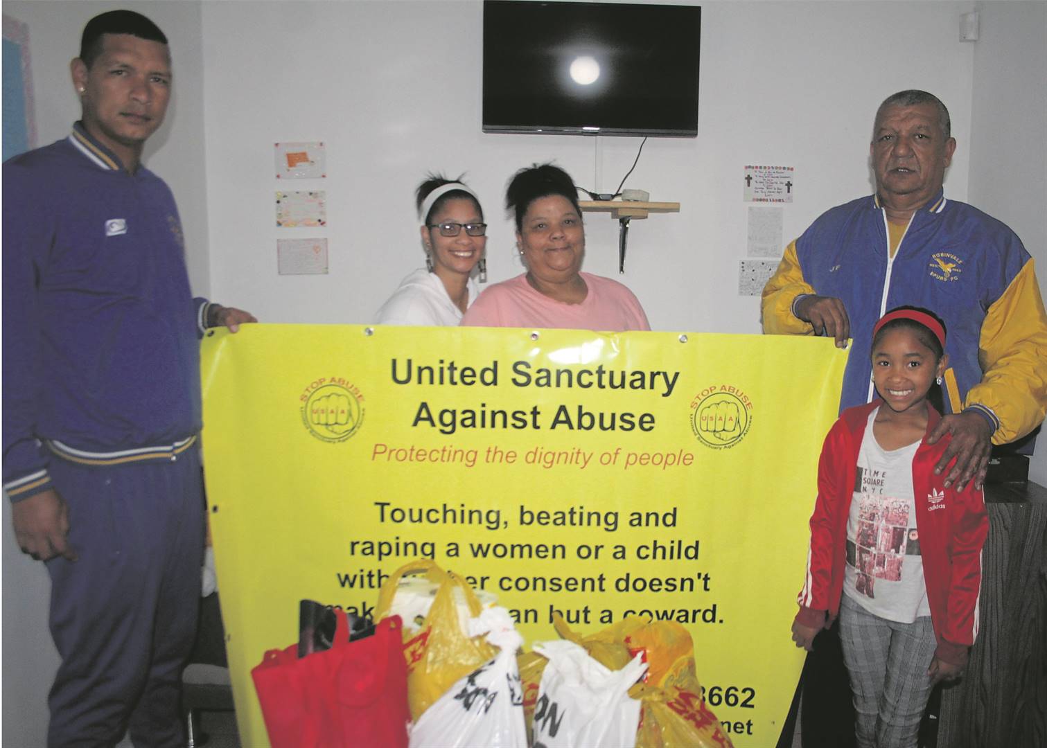 Robinvale Spurs het Donderdag 22 Augustus gewys dié klub waardeer vroue toe die klubvoorsitter, Remano February, Leazle de Villiers (sekretaris) en Jerome February (president), niebederfbare kos aan die huismoeder van United Sanctuary Against Woman Abuse, Mercia Johannes (in pienk), oorhandig het. Foto: Clement Trussell