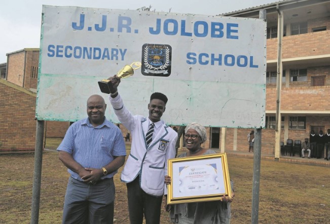IT was as if the rain was not pouring heavily on Wednesday, January 15, at James Jolobe Secondary School in Motherwell, when former learner, Petros Matinha, returned with his trophy and framed certificate in hand.