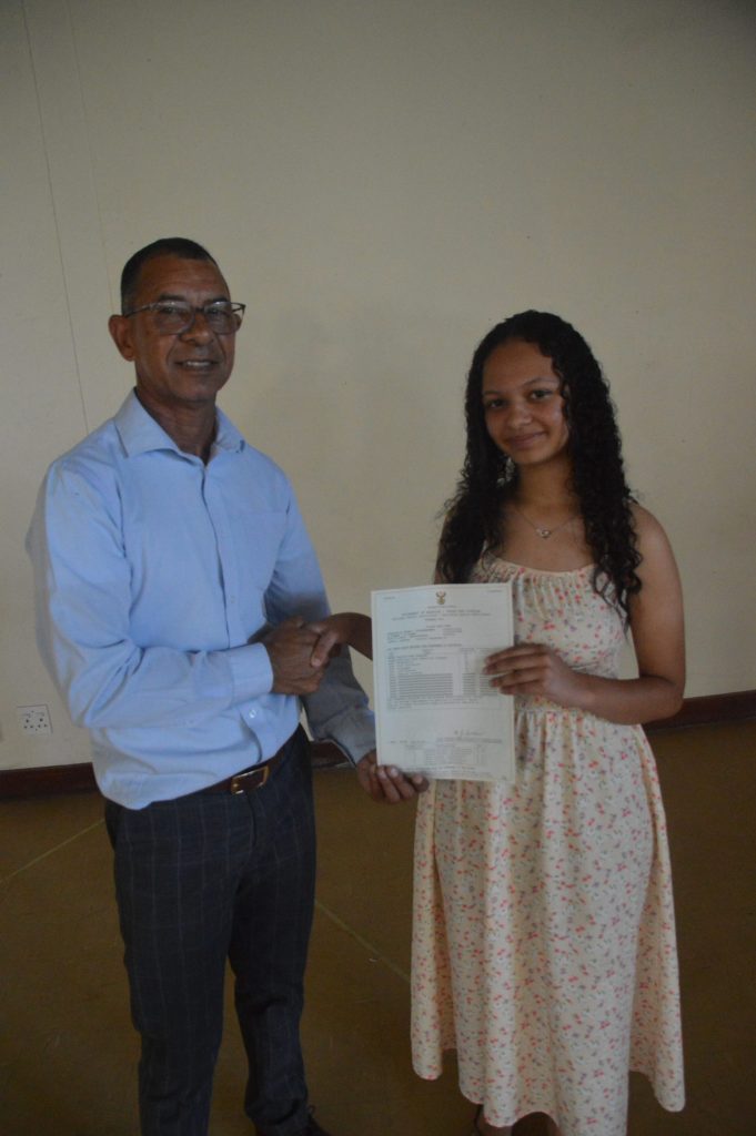 Vaughan Murray, skoolhoof van Robinvale Hoërskool, saam met die skool en dorp se topmatrikulant, Kyllah Dyers, wat vyf onderskeidings behaal het. Foto: Murphy Roberts