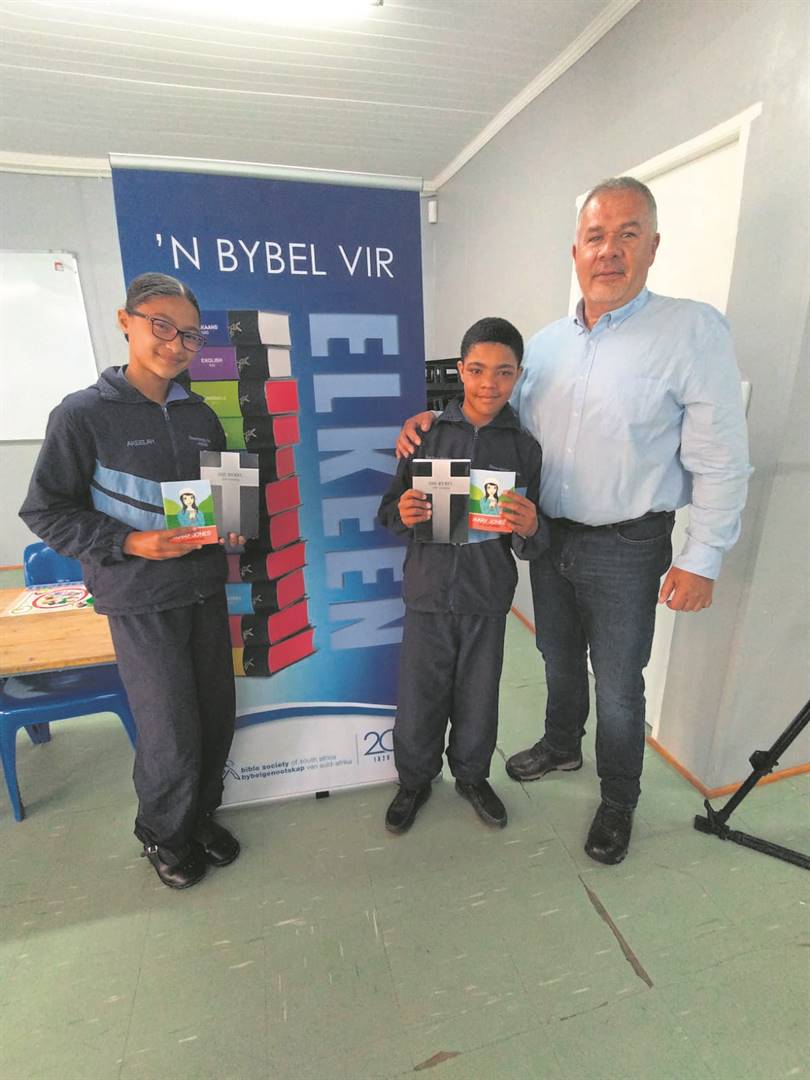 Ds. Christo Klopper (regs) het namens die Bybelgenootskap Bybels aan die gr. 7-leerders van Steenberg’s Cove Primêre Skool uitgedeel. Die skool het sy dank vir die mooi gebaar uitgespreek. Akeelah Don (links) en Nazrodeen Abdol (middel) is in onderhoude gevra wat die ontvangs van ’n eie Bybel vir hulle beteken.
