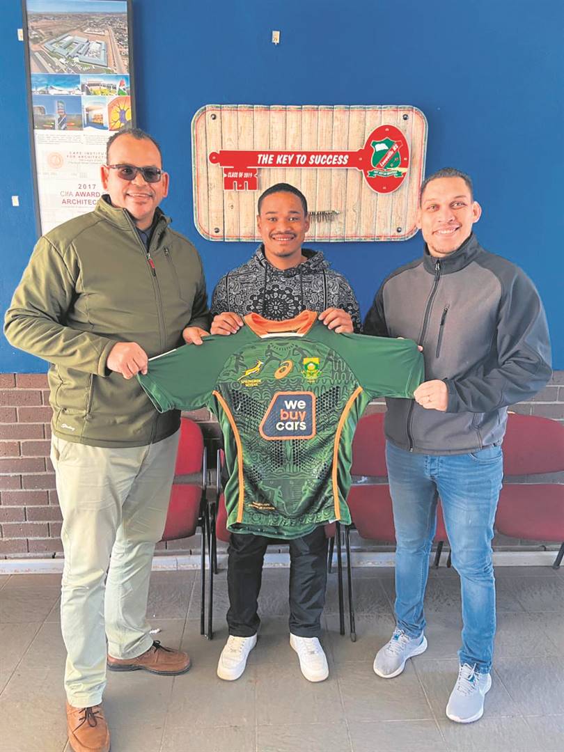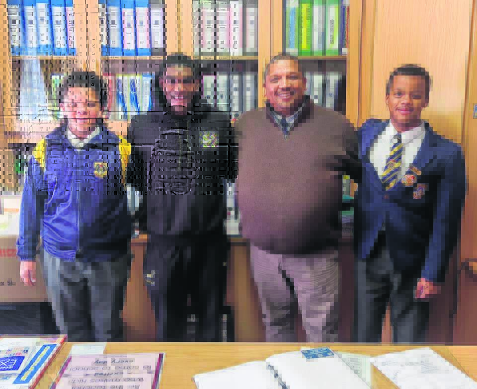 Chessie Jooste, die o.18- SA skolerugbyspeler, het die Laerskool Panorama onlangs besoek. Die skool glo hy gaan nog baie in die lewe bereik. Hy het die leerders met nederigheid kom groet. Hy het ook die skool se o.13-rugbykaptein en -onderkaptein ontmoet. Van links staan Gerald Louw (o.13-onderkaptein), Chessie, Hylton Langley (skoolhoof) en TJ Pieters (o.13-rugbykaptein). Foto: