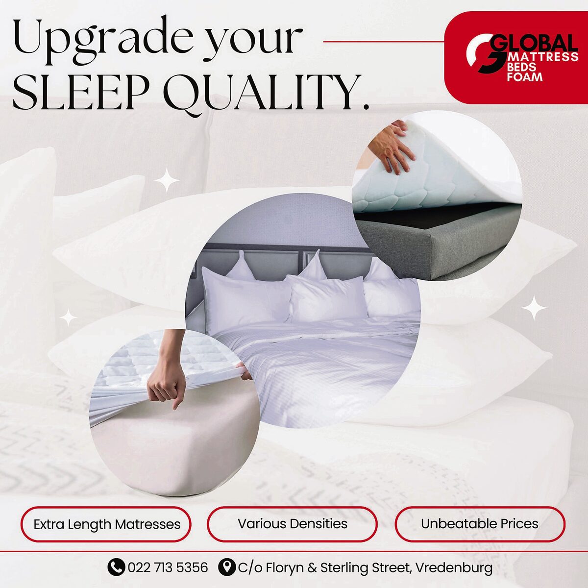 We are your sleep partner. If you are looking for comfortable mattresses at affordable prices, Global Mattress and Foam Vredenburg at Discount Boards Vredenburg is the place to go. We offer hotels, guesthouses, families, upholsterers, and other service providers quality beds and mattresses.