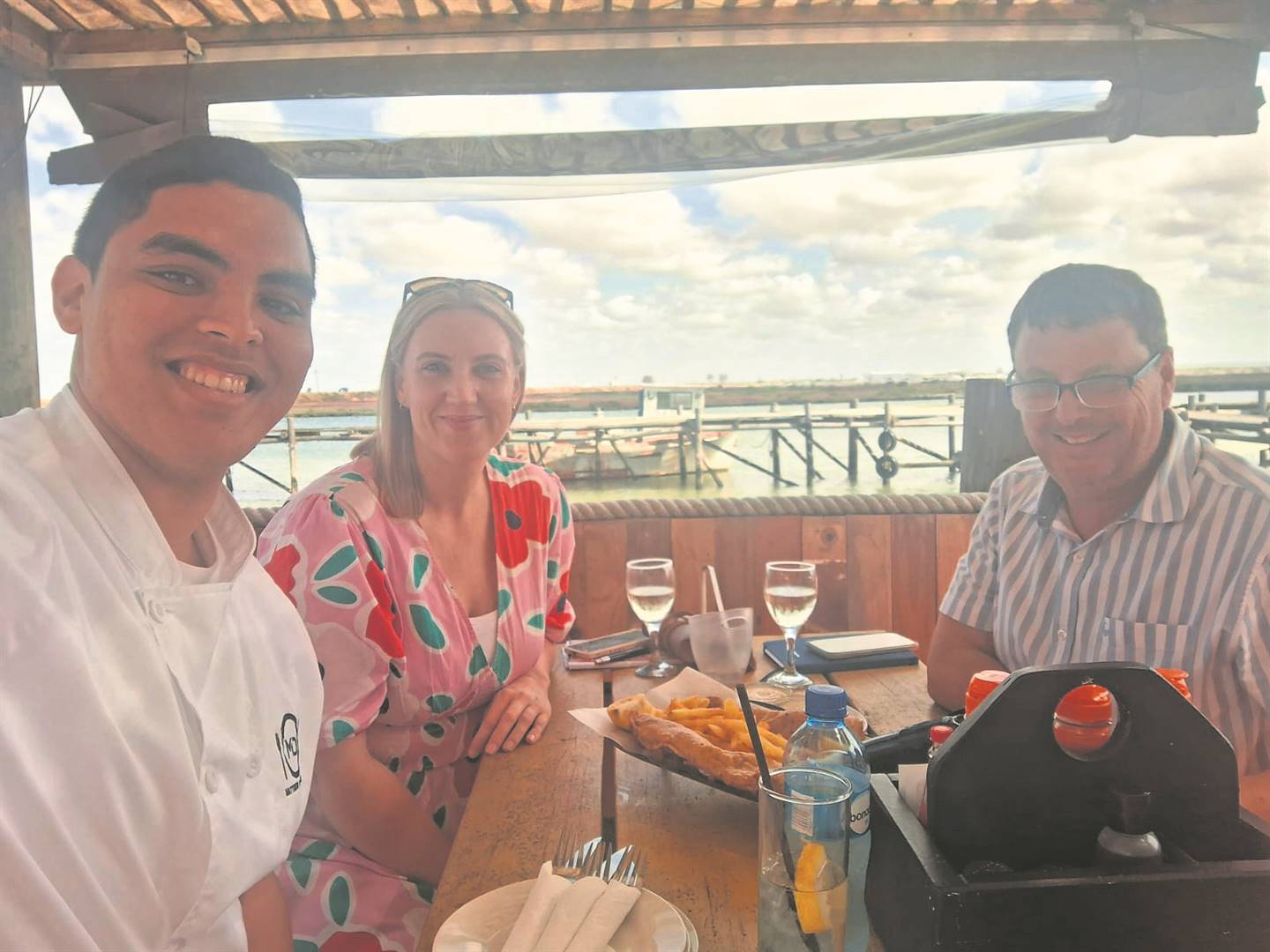 Beoordelaars in die restaurante-afdeling, Matthew Dreyden (Chef Matt), Maryke Swart (redakteur: Weskus Media) en Stefan Kolver (uitgewer: Weskus Media) hier by River Restaurant en Shipwreck Bar in Velddrif met die Bergrivier in die agtergrond.