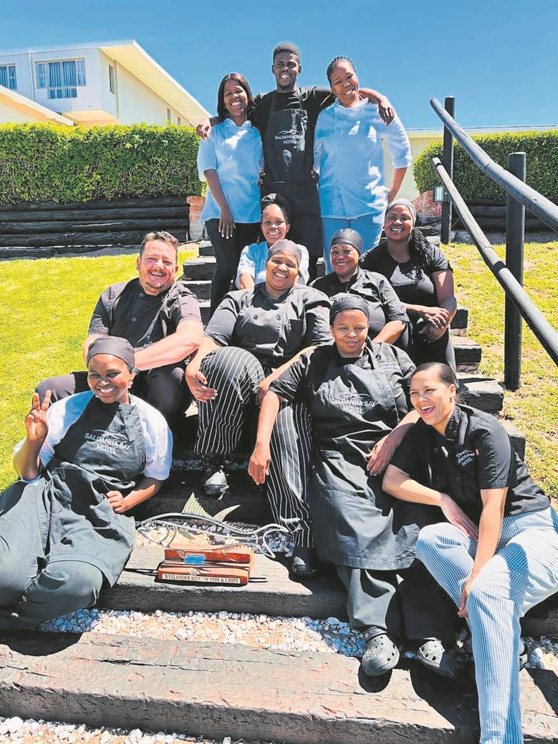 Sjef Wihan Pretorious en sy span wat hom in die kombuis ondersteun by die trofee wat hulle vir die volgende jaar die spogreg gee as beste vis-en-tjips-restaurant in die Weskus.