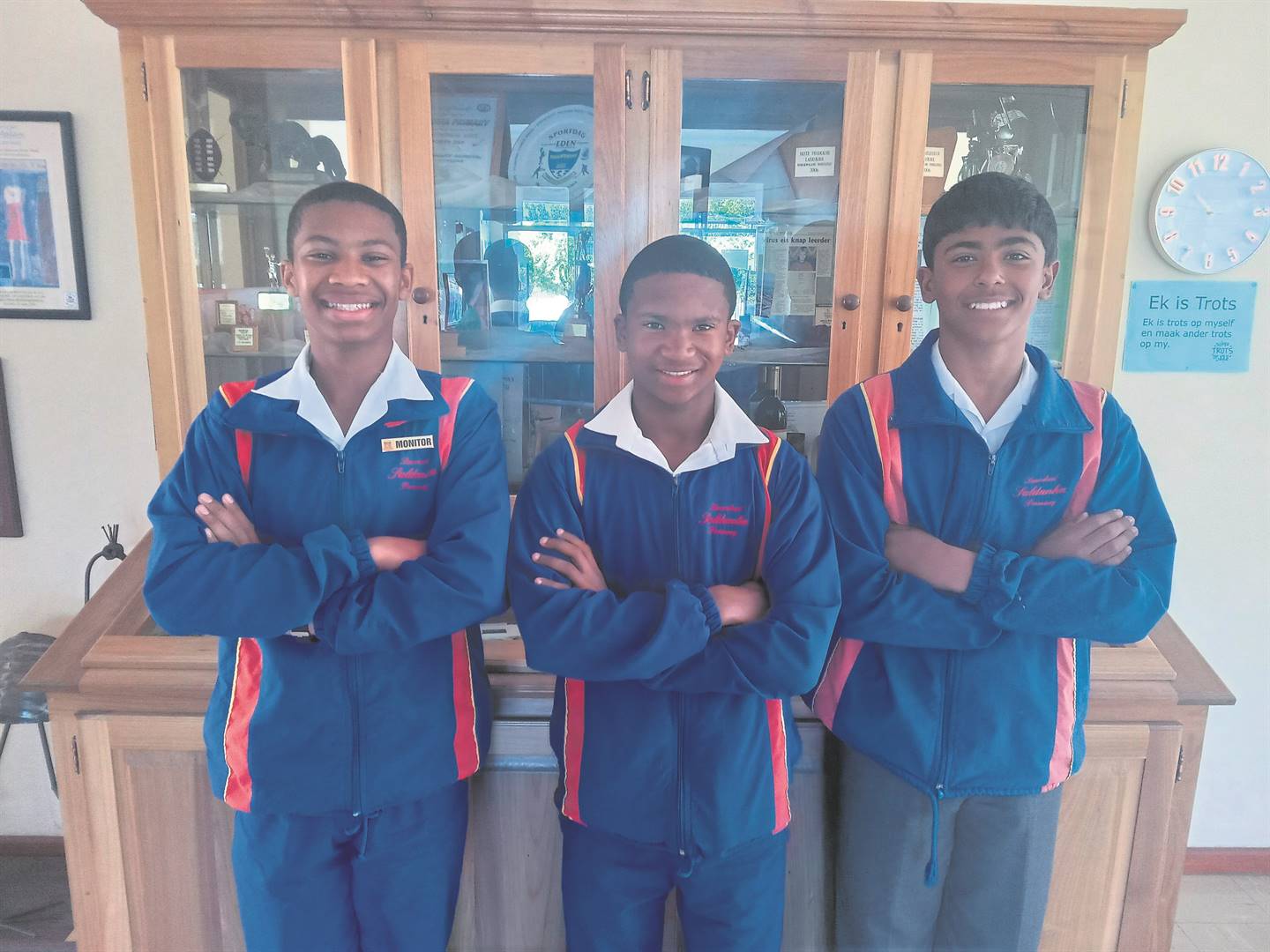 Laerskool Saldanha is baie trots op drie van sy leerders wat hul Boland-kleure in rugby verwerf het. Dyllon Dempers (links) is vir Boland se o.13-sewespan gekies. Dempers gaan van Donderdag 29 September tot 1 Oktober aan ’n nasionale sewestoernooi in Bloemfontein deelneem. El-Jay Alexander (middel) en Adam Adonis (regs) is in Boland se o.12-span opgeneem. Dié twee gaan aan ’n interprovinsiale toernooi, wat van Donderdag 29 September tot 1 Oktober in Riversdal plaasvind, deelneem.