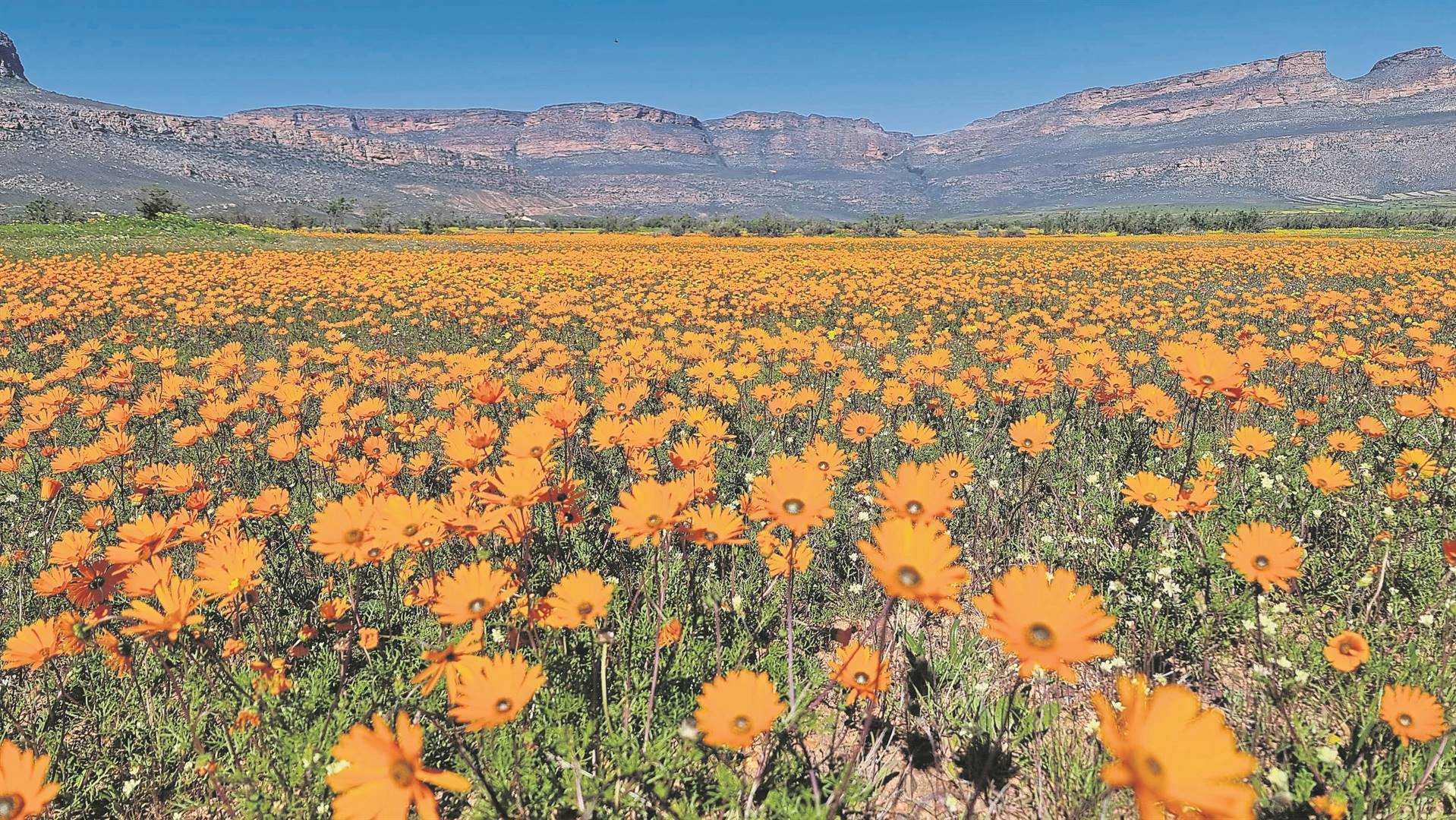 Large areas of flowers can be seen in the Seeberg, Mooimaak, and Postberg areas.