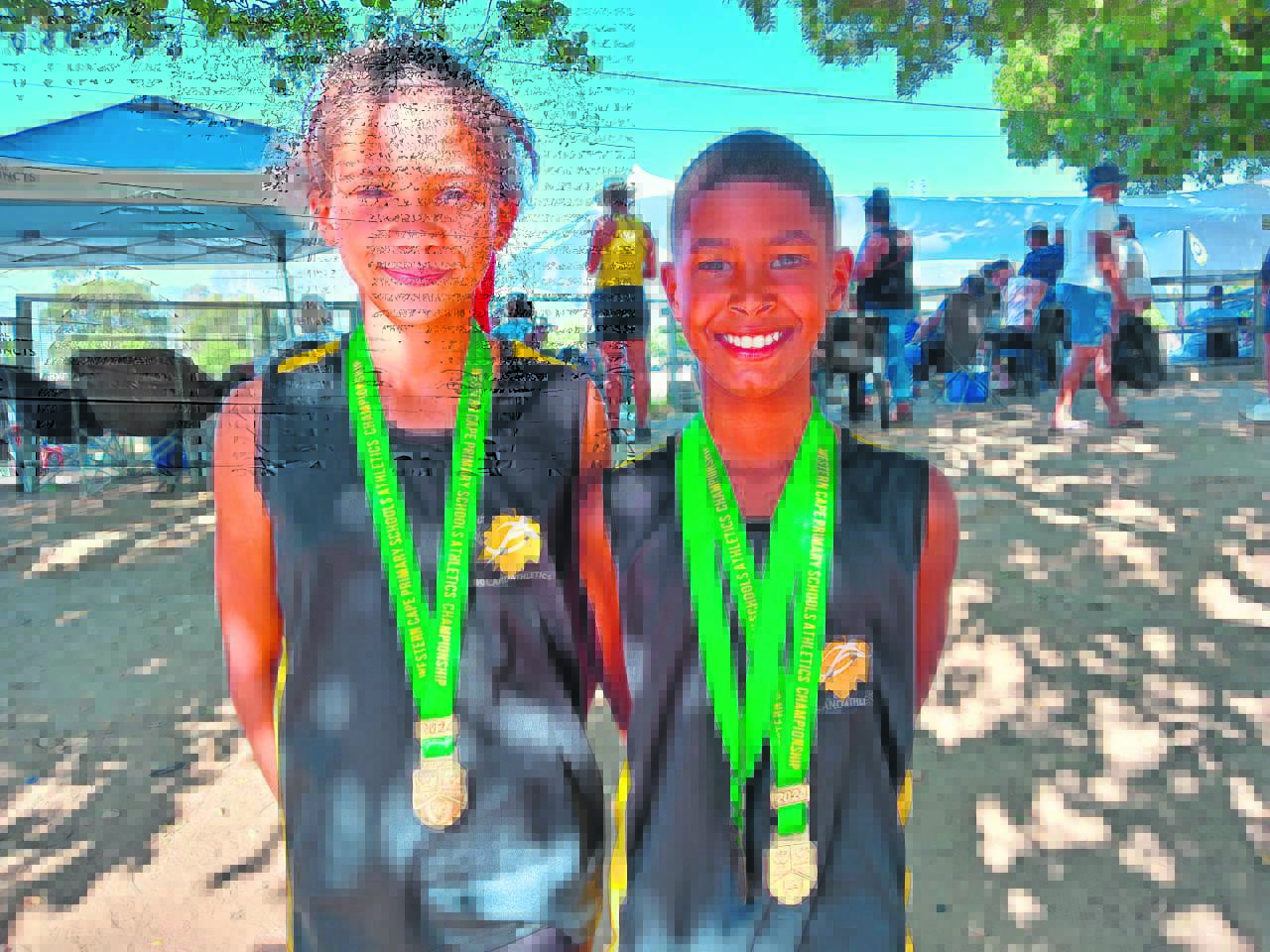 Die atlete van Langebaan Primêre Skool en lede van Langebaan-atletiekklub het die afgelope naweek aan die Wes-Kaap-atletiekkampioenskap vir laerskole in die Paarl deelgeneem. Twee gaan hul skool, klub en WP by die Suid-Afrikaanse-atletiekkampioenskap vir laerskole in Polokwane tussen Sondag 24 en Maandag 25 Maart verteenwoordig. Angell Pholman (links), die Wes-Kaapse kampioen in meisies o.13 (1 200 m), en Joshwin Cross, die Wes-Kaapse kampioen in die verspring vir seuns o.11 (hy het ook ’n silwermedalje vir die 80 m ontvang) gaan die skool verteenwoordig. Die skool bedank die afrigters Christopher Rodgers, Eustace Lemmetjies en dr. Frans Vent. Foto: