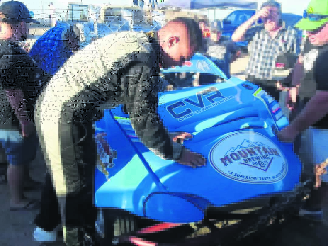 Sy blou renmotor het ongelukkig baie skade opgedoen.