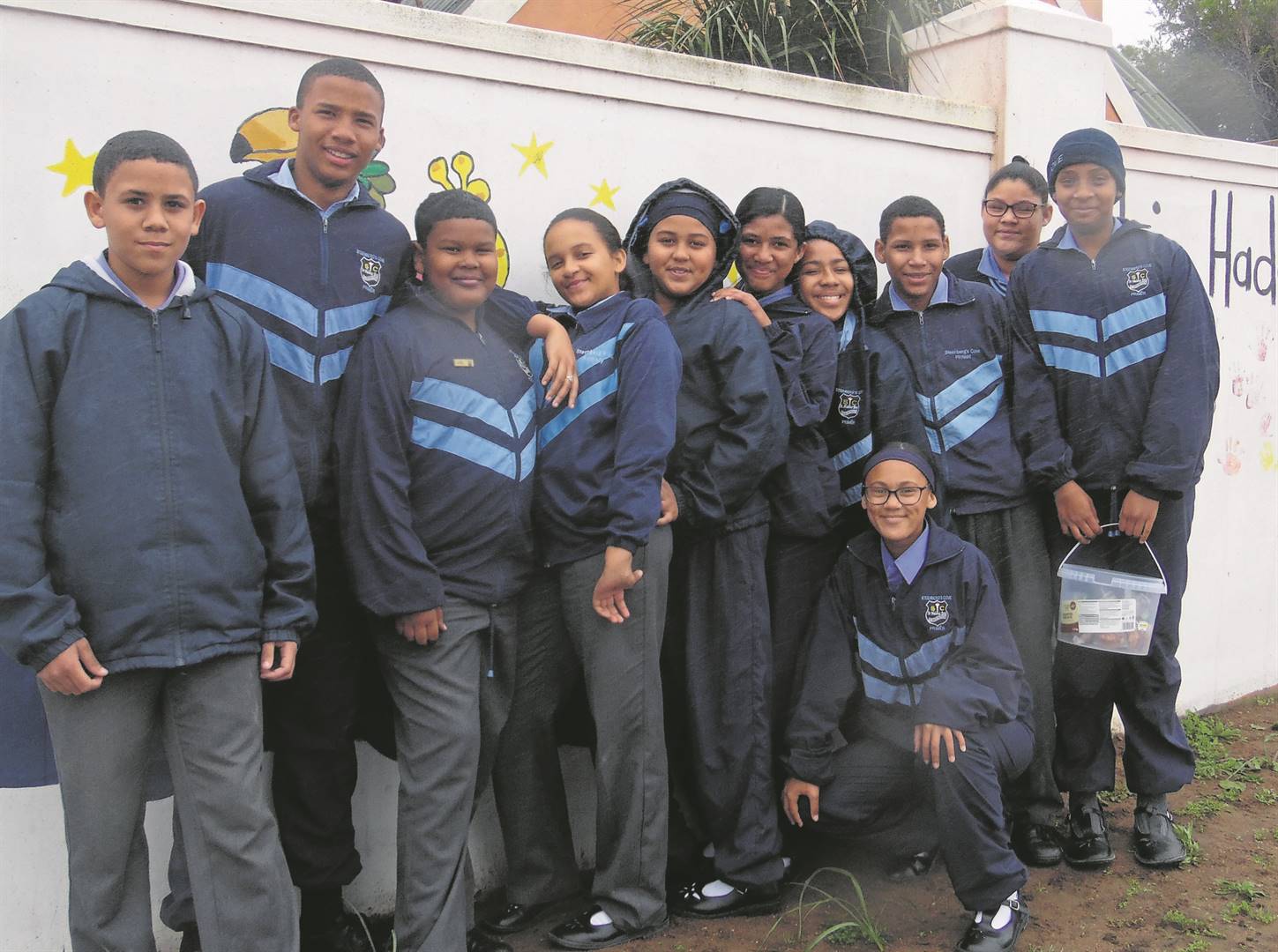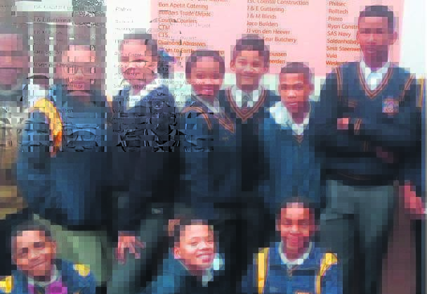 Diazville Primêr wil graag dankie sê aan die Holy Soul Crusade Young Adults vir hul skenking van skoolklere en skryfbehoeftes aan die leerders. Die skool waardeer dit opreg. Bo staan Kaylee Titus, die skoolhoof Lee-Anne Davids-Hartzenberg, Ben Peterson en Jonel Kekana. Foto: