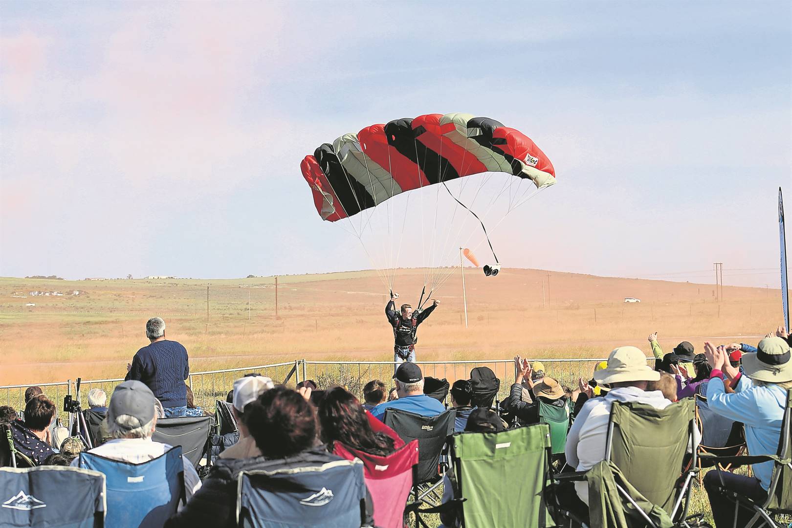 JeanJacques Wallis van Mother City Skydiving land onder toejuiging van die skare by die Saldanha-vliegveld tydens die Saldanha-lugskou wat Saterdag 1 Oktober gehou is. Wallis en sy kollegas wat net een van die vele hoogtepunte op die dag met talle vliegtuie, modelvliegtuie en self wedren-motors (mooi woord vir drags?) wat by die geleentheid te sien was. Meer op bl. 3Foto: Yaël Malgas