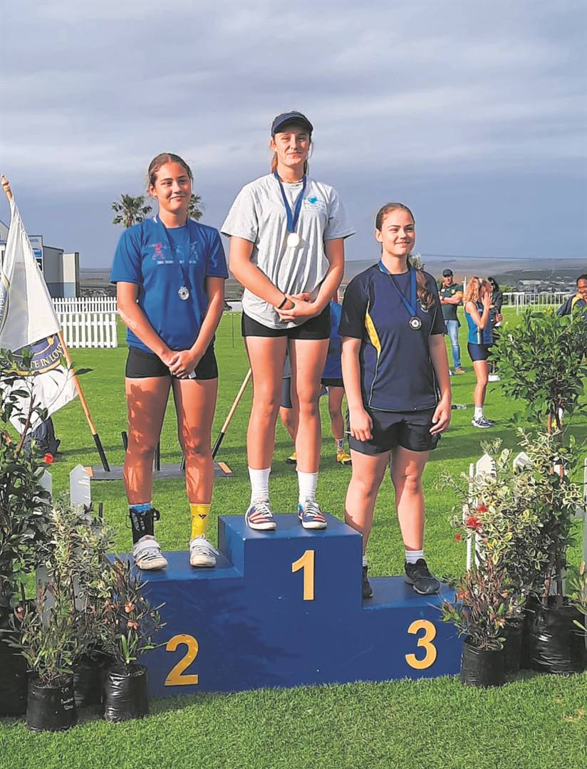 Mila Grobler (middel) van Longacres Privaatskool het Saterdag 12 Maart aan die Wes-Kaapse atletiekbyeenkoms deelgeneem. Sy het deurgaans haar resultate – in diskus sowel as gewigstoot vir meisies o.12 – by elke atletiekbyeenkoms waaraan sy deelgeneem het, verbeter. Mila het die derde plek in al twee haar items verower en gaan haar provinsie hierdie naweek (Vrydag 25 en Saterdag 26 Maart) by die SA kampioenskap in Potchefstroom verteenwoordig. By haar staan haar afrigters Jacques Potgieter (links) en Lucinda Noble. Foto: