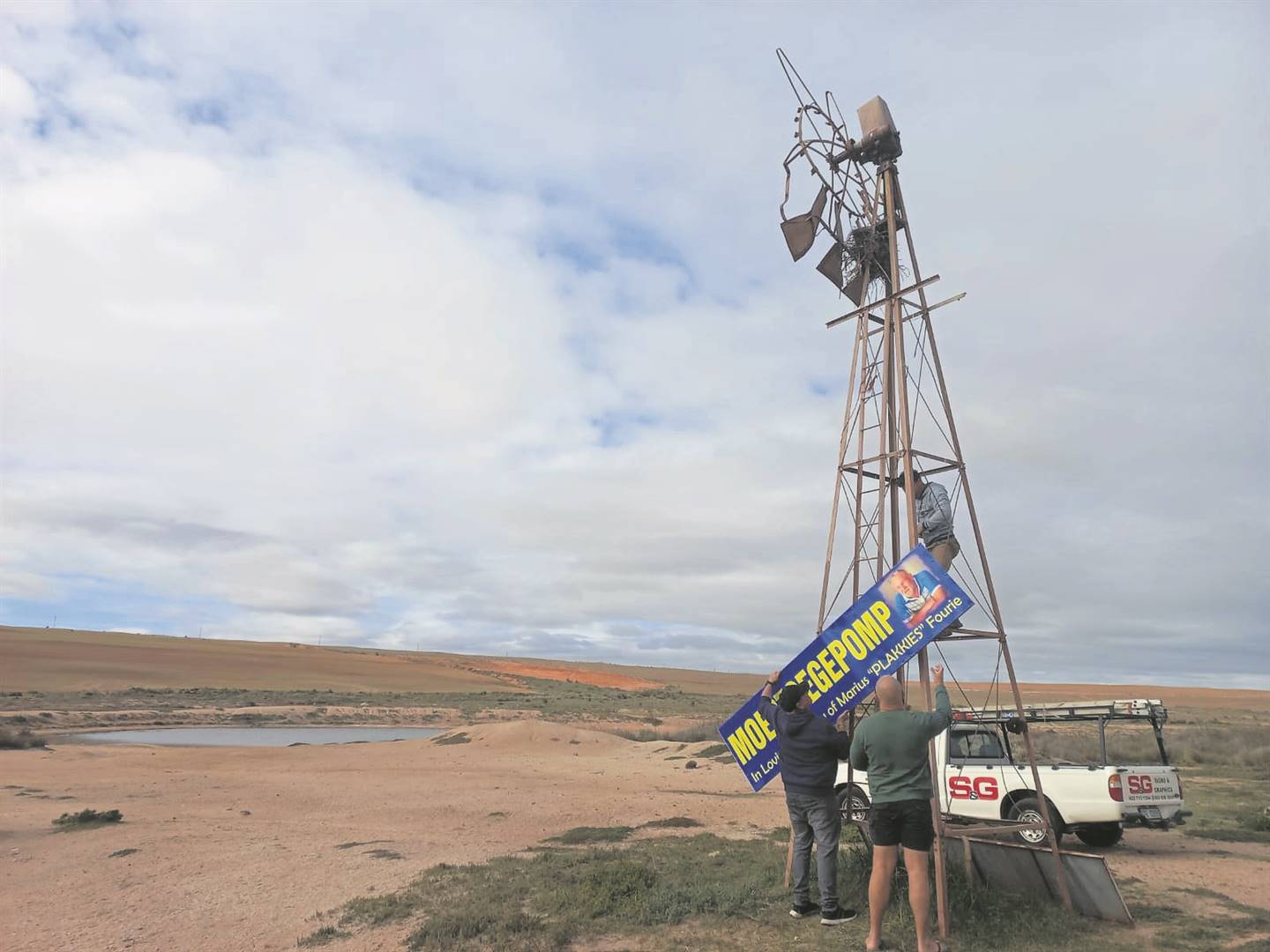 Christo Fourie, die seun van Wyle Marius Fourie (64), oud-Weslander-spotprenttekenaar en advertensiebord-sakeman, het dié nuwe Moertoegepomp-bord Woensdag 17 Mei ter nagedagtenis aan sy pa langs die Vredenburg-Paternosterpad opgerig. Marius, wat op 13 Mei aan kanker oorlede is, het toe hy die oorspronklike bord opgesit het, nooit gedink dat dit ’n Weskus-landmerk sou word waar toeriste poseer en selfies neem nie. Foto: Signs & Graphics