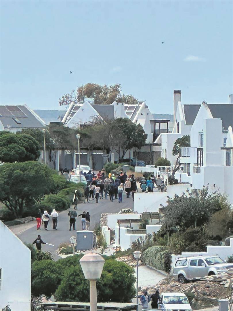 ’n Groep inwoners van Paternoster loop deur die strate om hul ontevredenheid oor werk vir “onwettige immigrante” te kenne te gee.Foto: Alida Buckle